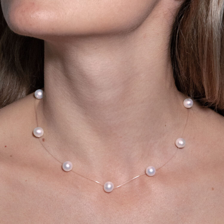 White Pearl Necklace on Illusion Cord | 7.5 – 8.5 mm | Round Pearls | 7 pcs.